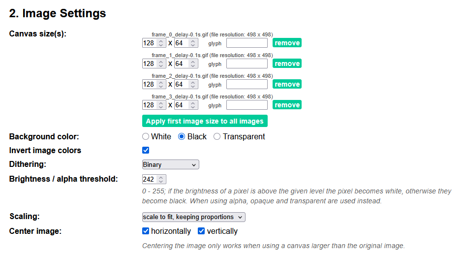 Upload all the frames to: https://javl.github.io/image2cpp/ There are a few settings you will want to play with here, especially image size, scaling, brightness, and center image. Double check the preview screen to make sure you have your settings correct.