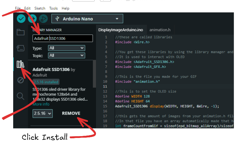 Open the Arduino IDE and go to the library manager. Download the Adafruit SSD1306 library. (A library is just code someone else made for you to use in your code.)