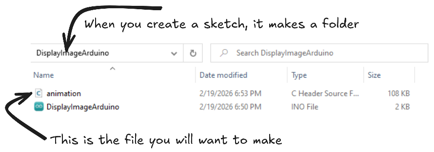 We are going to make a new sketch in Arduino IDE and then save it with a name you will remember. Next you will want to make a file called "animation.h" (using notepad or VS code) in your arduino project folder that you just made.
